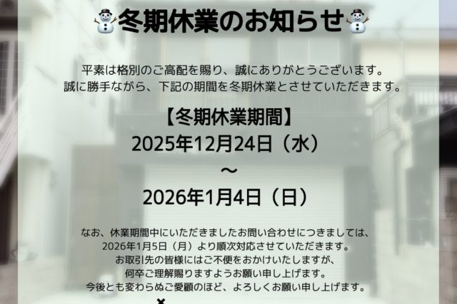 平素は格別のお引き立てをいただき厚くお礼申し上げます。 弊社では、誠に勝手ながら下記日程を冬期休業とさせていただきます。 ■冬期休業期間 2025年12月24日(水) ~ 1月4日(日) 休業期間中にいただいたお問合せについては、営業開始日以降に順次回答させていただきます。 皆様には大変ご不便をおかけいたしますが、何卒ご理解の程お願い申し上げます。